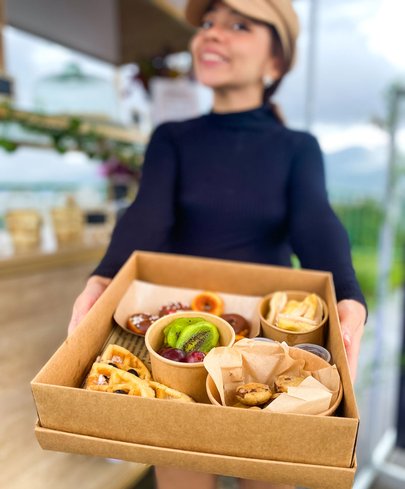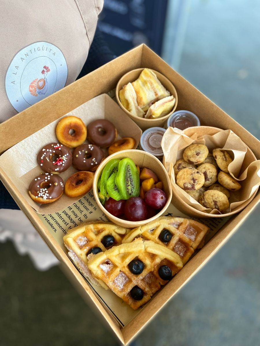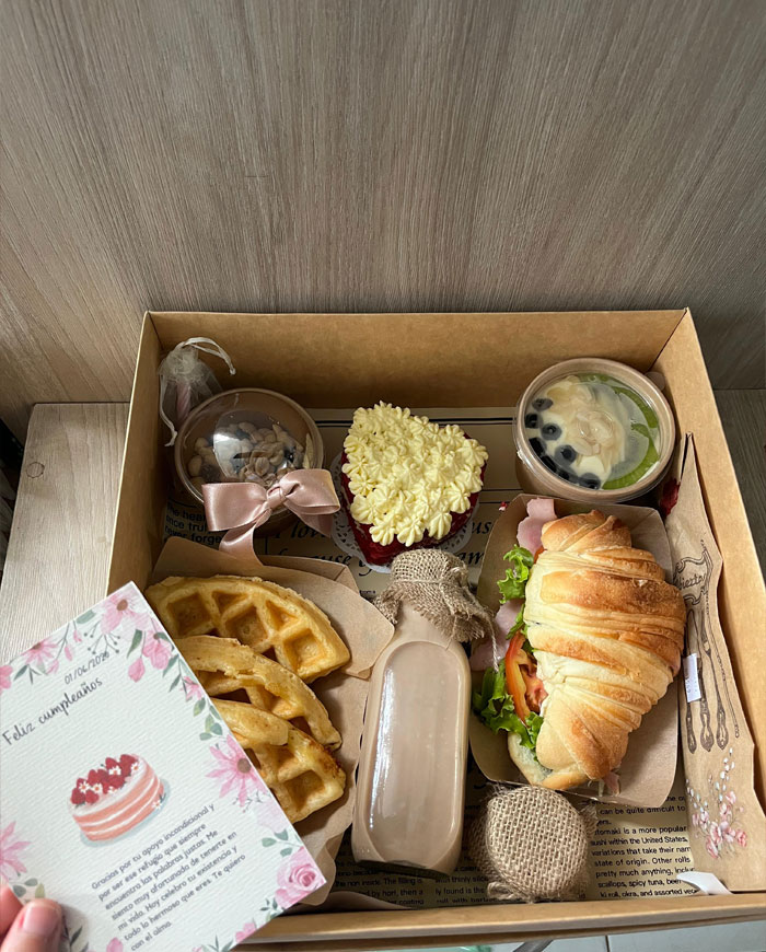 Nuestros desayunos incluyen alimentos frescos y hechos a mano, bebida caliente o fría, decoración temática y tarjeta personalizada, todo presentado con un estilo nostálgico y encantador.
